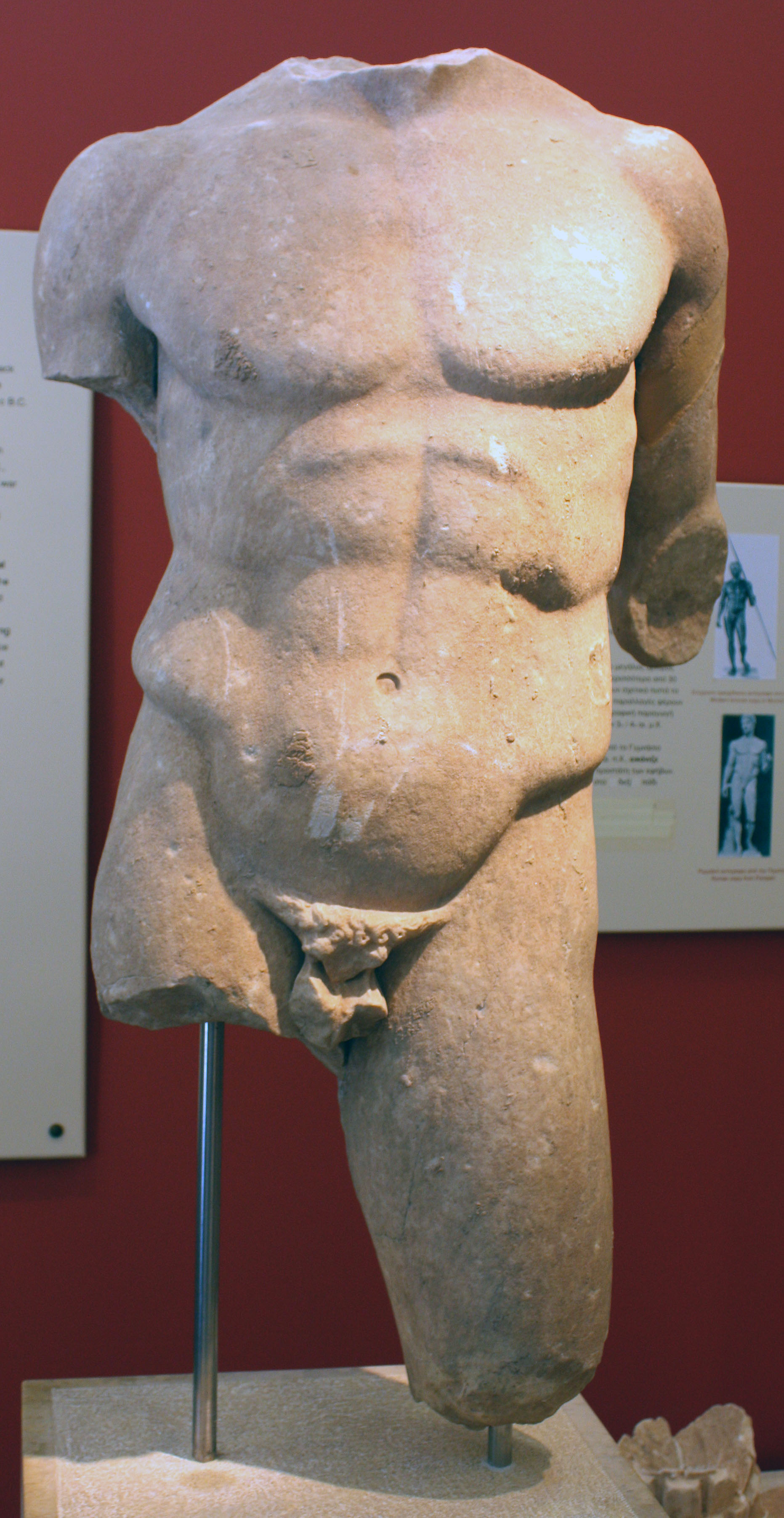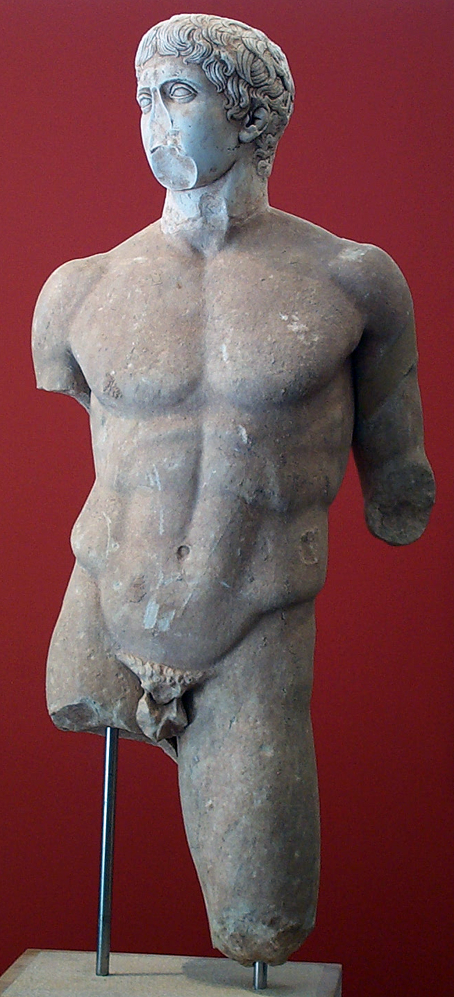 A copy of the Doryphoros by Polykleitos of Argos from Room II in the West Stoa of the Gymnasium.
