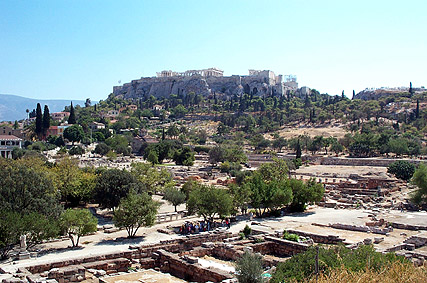The Public BuildingsView from the Kolonos Agoraios looking south-east towards the akropolis. At the foot of the hill lie the buidlings of the democracy: the Metroon, the New Bouleuterion, and the Tholos. The Great Drain runs along the line of the first line of trees, with the Eponymous Heroes immediately beyond. The Middle Stoa forms the southern boundary of the agora. In the distance to the left is the southern end of the Stoa of Attalos which formed the eastern boundary of the Agora.