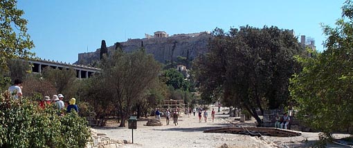 View along the Panathenaic Way from the agora and towards the akropolis. The Stoa of Attalos appears on the left.