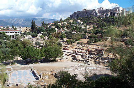 The southern agoraView looking east. At the foot of the hill is the Metroon and the Tholos. The Middle Stoa lies to the right, and in the distance to the left is the reconstructed Stoa of Attalos.