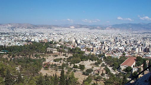 The Agora from the Athenian akropolis. The Hephaisteion stands on the Kolonos Agoraios on the west side of the Agora. The Stoa of Attalos marks the east boundary. |