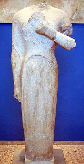KoreFind-spot: found in 1887 on the east side of the Erechtheion. Akropolis Museum, no. 619. Naxian marble. H. 1.43 m Comments Kore originally held a round object. Dress: chiton and a short Ionic himation. Hurwit suggests a Naxian sculptor: either based in Attica working for Athenian patrons, or selling completed statues to Athenian patrons from Naxos. Dating in the period '575-550' (Hurwit) '575-550' (Richter) References Dickins, Guy. 1912. Catalogue of the Acropolis Museum I (Cambridge: Cambridge University Press), 150 ff, no. 619. Hurwit, Jeffrey M. 1999. The Athenian acropolis: history, mythology, and archaeology from the Neolithic era to the present (Cambridge: Cambridge University Press), 104 (and n.22). Payne, Humfry Gilbert Garth, and Gerard Mackworth Young. 1936. Archaic marble sculpture from the Acropolis (London), 9, pl. 20. Richter, Gisela M.A. 1968. Korai: archaic Greek maidens. A study of the development of the Kore type in Greek sculpture (London: Phaidon Press), 47, figs. 194-97, no. 58. |