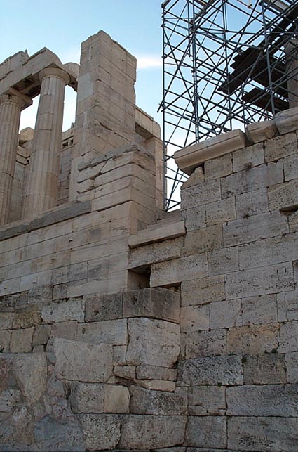 The Nike TempleStaircase to the precinct of the temple of Athena Nike. Notice the pilaster on Pier W of the Propylaia. The Doric columns belong to the Propylaia. |