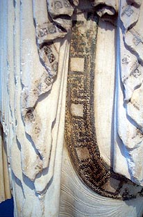 Kore'Island' marble. H. 1.23 m. Find-spot: 'Found in 1887, east of the Erechtheion'. Date: 'about 510-500' (Richter). Dress: chiton and Ionic himation. BibliographyRichter, Korai, no. 124. |