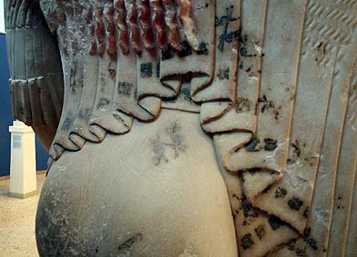 Kore'Island' marble. H. 1.825 m (incl. plinth). Find-spot: 'Found in 1886, north-west of the Erechtheion'; 'lower legs and feet were found separately'. Date: 'about 525' (Richter), 'about 530-520' (Boardman). Dress: chiton and Ionic himation. BibliographyRichter, Korai, no. 116. Boardman, Archaic Sculpture, fig. 151. |
