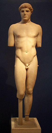 'Kritian boy'Athens, Akropolis Museum 698 Parian marble. Find-spot: 'Body found 1865/6 south-east of Parthenon; head in 1888 between Museum and south wall.' Publ.Hurwit, Jeffrey M. 1999. The Athenian acropolis: history, mythology, and archaeology from the Neolithic era to the present (Cambridge: Cambridge University Press) 148, fig. 117 ('c. 479-475 BC'). Payne, Humfry Gilbert Garth, and Gerard Mackworth Young. 1936. Archaic marble sculpture from the Acropolis (London) pls. 109-12. Richter, Gisela M.A. 1970. Kouroi: archaic Greek youths. A study of the development of the Kouros type in Greek sculpture (New York: Oxford University Press) 149, figs. 564-69, no. 190. |