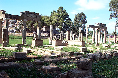 Dining RoomsView looking south-west, taken from inside the colonnade on the north side of the dining rooms. Beyond the stoa is the terrace with the temple of Artemis. |