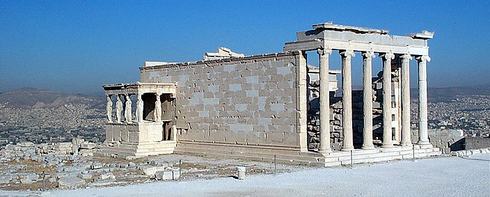 The Erechtheion from the south-east. The archaic temple of Athena lies alongside the Caryatid porch.