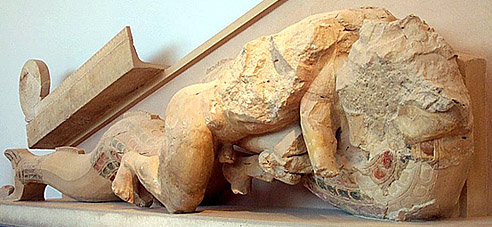Herakles wrestling with Triton or Sea-godPediment from the Hekatompedon. Probably from the same side as 'Bluebeard'.