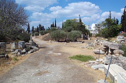 Looking towards the Tritopatreion along the Sacred Way. The sanctuary of the Tritopatres is marked by horoi, probably dating to the end of the 5th century BC. |