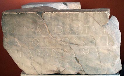 The kouros base of the Karian Tymnes signed by the sculptor AristoklesFind-spot: 'Themistoklean wall' Kerameikos Museum. Bilingual inscription. References Richter, Gisela M.A. 1970. Kouroi: archaic Greek youths. A study of the development of the Kouros type in Greek sculpture (New York: Oxford University Press), 138, under no. 161. |