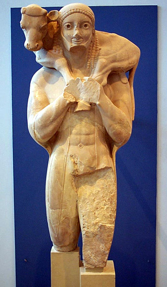 MoscophorosAthens, Akropolis Museum 624 Dedication by Rhonbos (?) Hymettan marble Paint: calf originally bluish-green PublicationsHurwit, Jeffrey M. 1999. The Athenian acropolis: history, mythology, and archaeology from the Neolithic era to the present (Cambridge: Cambridge University Press) 103, fig. 71 ('c. 570-560') |