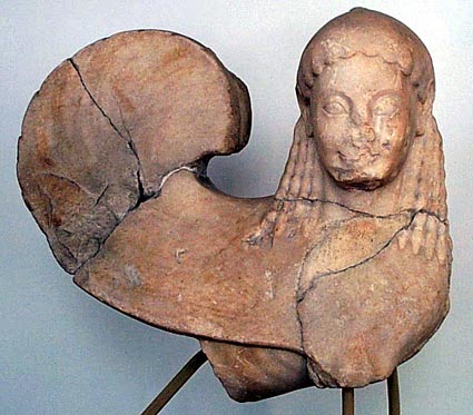 Sphinx probably from top of steleFind-spot: found at the foot of the Themistoklean Wall; upper part of the wings found in the Kerameikos Island marble Present location: Athens NM 2891 BibliographyRichter, Gisela M.A. 1961. Archaic gravestones of Attica (London: Phaidon Press) 17, figs. 54-57, no. 16. |