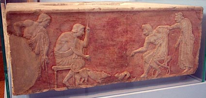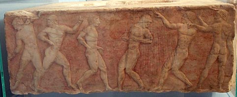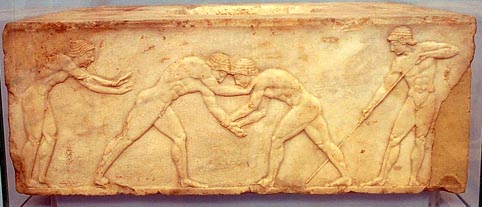 Kouros base from the Themistoklean wallWrestlers; athletes; young men baiting cat and dog Find-spot: from a funerary spot outside the Peiraieus gate BibliographyJeffery, L.H. 1962. The inscribed gravestones of archaic Attica. Annual of the British School at Athens 57: 127, no. 1. |
