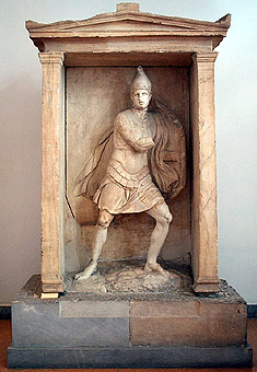 The Naiskos of Aristonautes Find-spot: near the Dipylon Gate (1861). Date: c. 320 BC (Kaltsas) Pentelic marble H. 2.48 m, w. 1.55 m Present location: Athens, NM 738. Inscription: Aristonautes son of Archenautes of the deme of Halai. Publication Kaltsas no. 410 Knigge 43, fig. 40 |