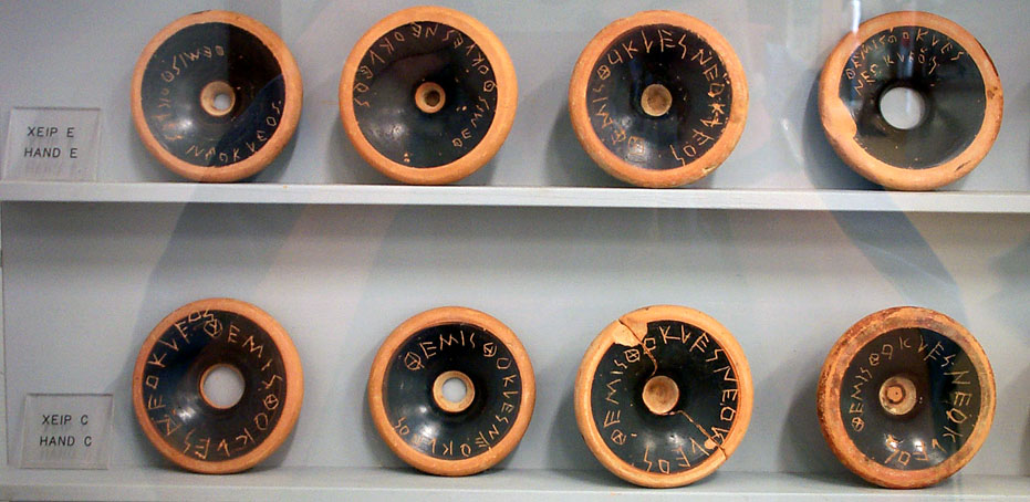 Ostraka of ThemistoklesPart of the cache of 190 ostraka from a well on the North Slope of the Athenian akropolis. Fourteen different hands are represented in the deposit (two are shown here). It appears that the ostraka were pre-prepared.