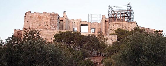 The western approach to the Akropolis. On the left (north) is the Pinakotheke, and on the right (south) the Nike bastion.