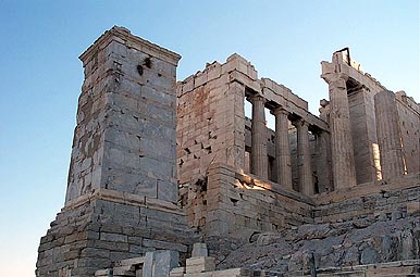 The Propylaia and the monument of Euemenes IIThe north wing of the Propylaia from the stepped approach. To the left is the monument of the Attalid king Euemenes II, dating to the early second century BC. This monument was built in Hymettian marble and supported a chariot. It was reused in the Augustan period to celebrate Marcus Agrippa, the son-in-law of the emperor, who visited the city in 15 BC. |