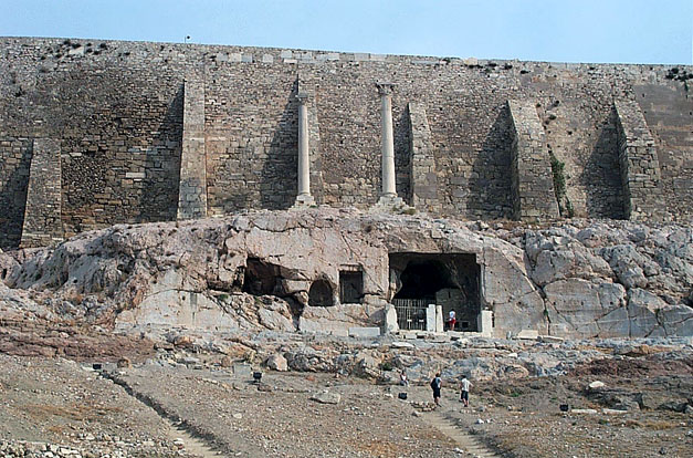 Theatre of DionysosThe choregic monument of Thrasyllos of Dekeleia, the choregos, placed in a cave on the south slope of the Akropolis above the theatre of Dionysos. The Corinthian columns belong to a Roman monument. Date: 320/19 BC. Bibliography Camp II, J. M. 2001. The archaeology of Athens. (New Haven: Yale University Press) 162-63, fig. 157. Inscription: IG II2 3056.